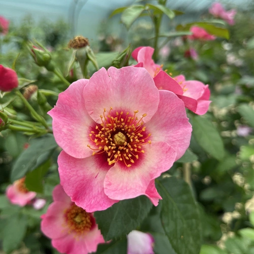 Róża rabatowa należąca do grupy Hulthemia Persica, kwiaty jasnoróżowe z różowym oczkiem. Wysokość około 100 cm i szerokość 130 cm. Dobra odporność na choroby. Powtarza kwitnienie.