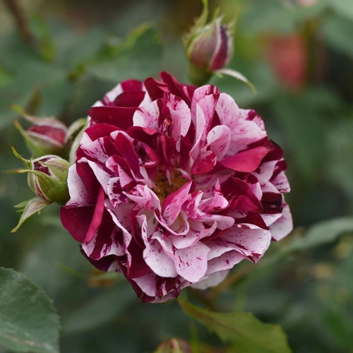 Niezwykła róża rabatowa o unikalnych, pasiastych kwiatach w odcieniach kremu, czerwieni i borda. Każdy kwiat wygląda inaczej – jedne mają wyraźne smugi i plamki, inne tworzą marmurkowe przejścia kolorystyczne. Kwiaty są półpełne, średnicy ok. 8–10 cm, a ich intensywny, herbaciany zapach przyciąga uwagę już z kilku kroków.
