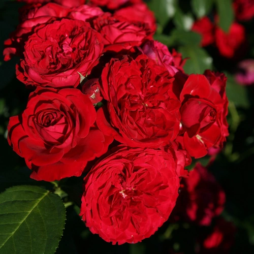 Róża rabatowa Rotkäppchen to niezwykle efektowna odmiana o intensywnie czerwonych, pełnych kwiatach. Kwiaty są gęsto wypełnione płatkami, tworzą rozetowe, lekko pofalowane formy i pojawiają się najczęściej w niewielkich kiściach, co dodatkowo wzmacnia efekt dekoracyjny.
